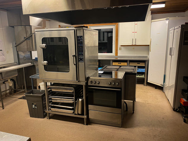 Kjøkkenet er utstyrt med komfyr, kombidampar, steamer, kjøleskap, frys og oppvaskmaskin.